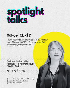 13 Mart Perşembe günü, saat 12.45’de, Mimarlık Fakültesi Stüdyo 304’te Gökçe Çerit ile Mekansal Planlama perspektifinden Afet Dirençliliğinde Afad’ın Risk Azaltma Çalışmalarını içeren bir seminer düzenmiştir.