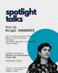 10 Nisan Perşembe günü, saat 12.45’te, Mimarlık Fakültesi Stüdyo 304’te, değerli konuğumuz Prof. Dr. Nilgül Karadeniz ile “Mekânsal Planlama-Tasarım Süreçlerinde Ekolojik Sistemler Nasıl Okunabilir: Mogan Gölü-Eymir Gölü-İmrahor Vadisi Örneği” başlıklı seminer düzenlenmiştir. Jeolojik oluşumlarından günümüze bu üçlü sistemin ekolojik bütünlüğü ve özellikle İmrahor Vadisi’nin karşı karşıya olduğu baskılar mekânsal bir perspektiften ele alınmıştır.